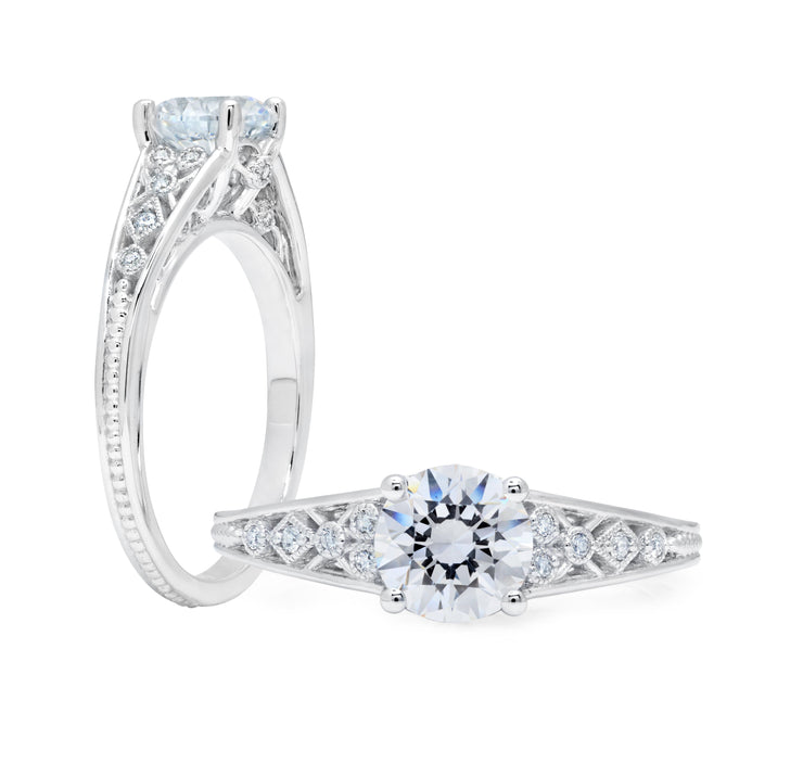 A Peter Storm 14k white gold round diamond solitaire engagement ring; milgrained detail cathedral vintage inspired semi-mount, dias. 0.08ctw. Center Stone not included; size 6.5 In-Stock for Immediate Delivery. Other sizes are available upon request—please contact us at 512-451-0338 or sales@avantgardejewelers.com. An engagement ring of sophistication and exclusivity, sure to capture lasting memories.