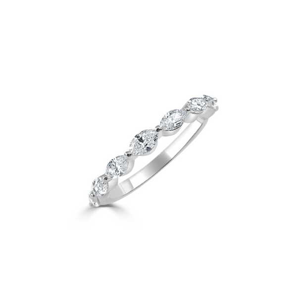 Regular price $2,475.00 Save $-2,475.00This 14K white gold ring features a half way setting for marquise diamonds. This setting is known as the “East-West” setting, where the marquise diamonds are set diagonally across the finger. This unique setting is perfect for a wedding band or a stackable fashion ring. Total weight of diamonds are .75ctw.