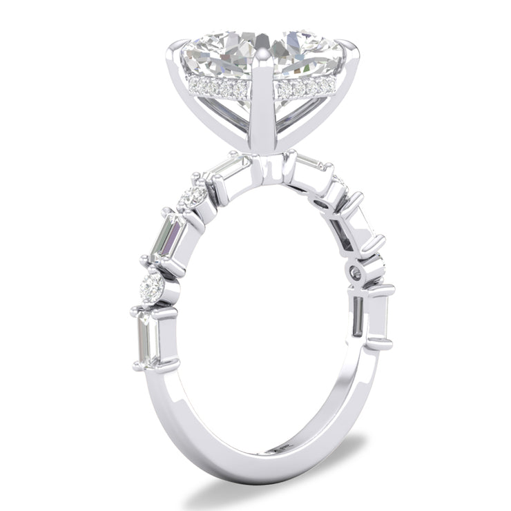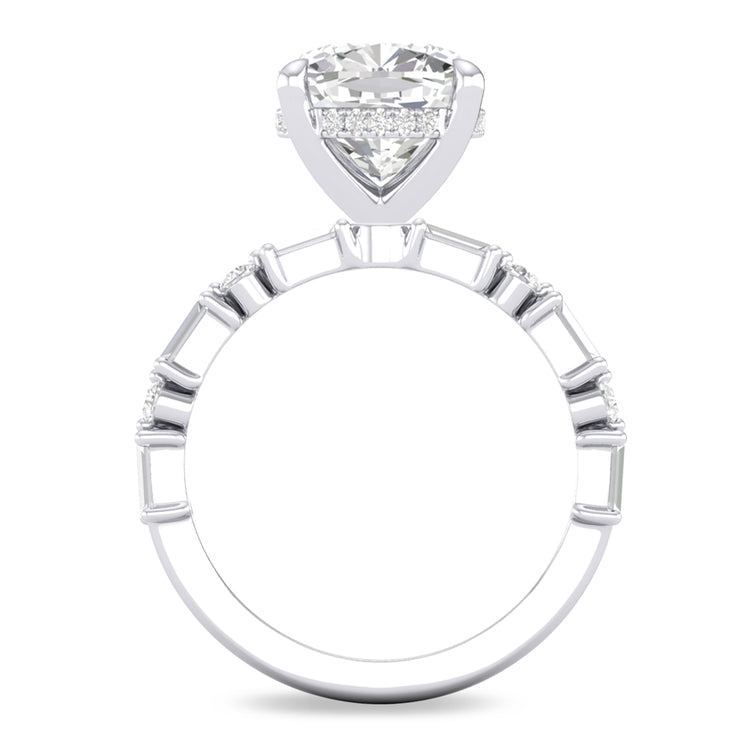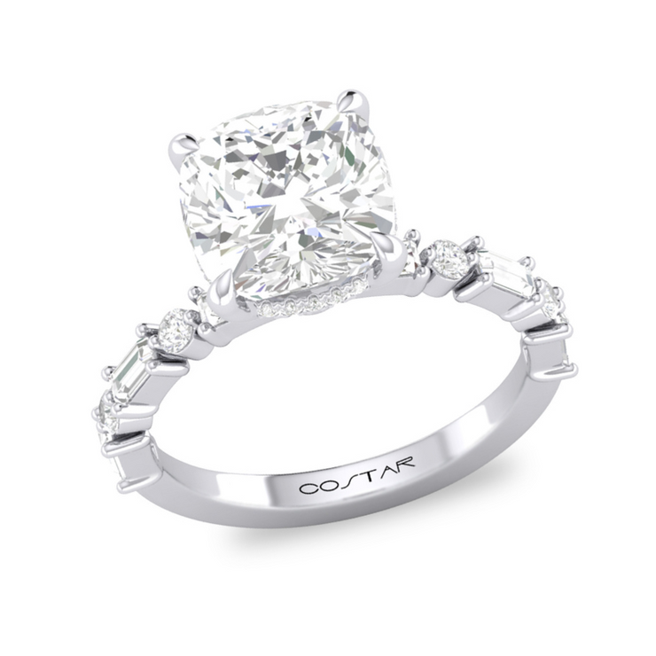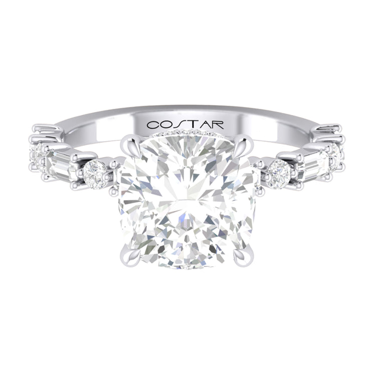 Regular price $2,750.00 Save $-2,750.00Introducing this classic and stunning 14k white gold cushion cut diamond hidden halo engagement ring with alternating baguette and round diamonds on the band totaling 0.51ctw.
