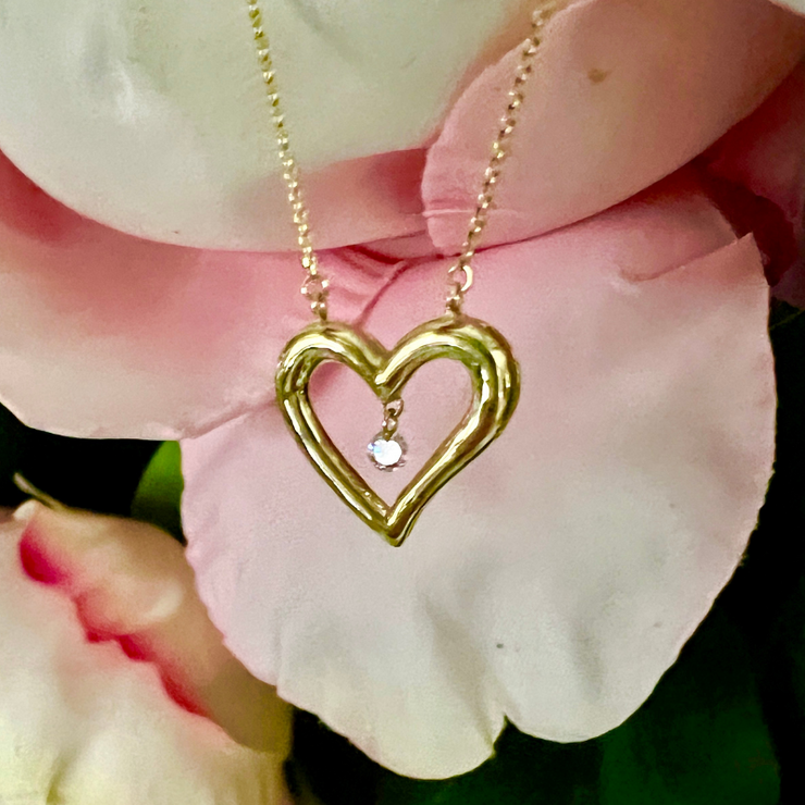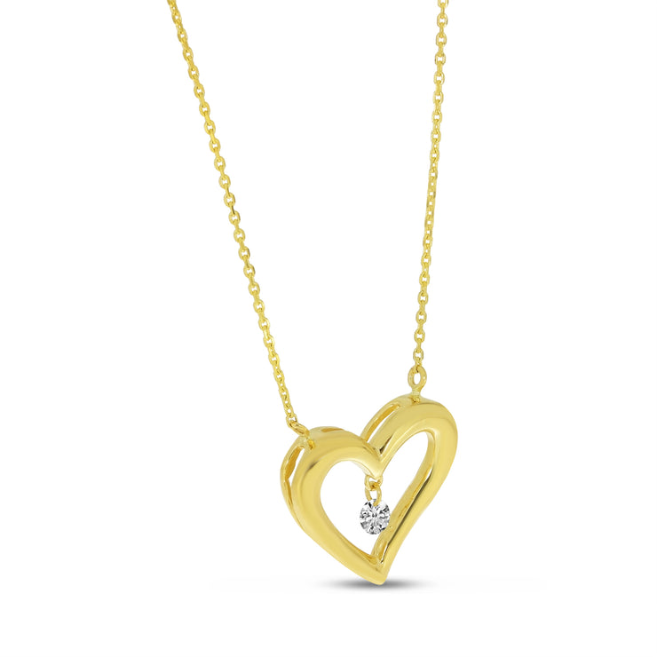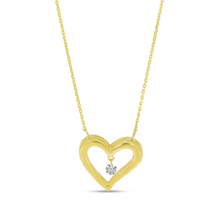 Regular price $502.00 Save $-502.00This stunning 14k yellow gold open heart necklace with a dash of romantic sparkle can be worn with anything and everything. A total of 0.05ctw, the round diamond dangles from the heart's center. The chain length is adjustable from 16" to 18". This is a gift for someone you love, or for yourself.