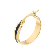 Step out in style with these 14k Yellow Gold Medium Black Enamel Round Hoops, measuring 15x4mm and featuring a convenient hinged closure.