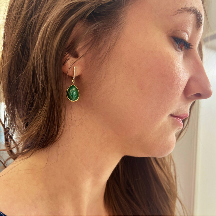 Regular price $1,095.00 Save $-1,095.00Elevate your ear game with these dazzling 14k Yellow Gold Pear Cut Malachite and Diamond Drop Earrings, featuring 13.27ctw and 0.10ctw. Malachite, the "transforming stone," brings good vibes of growth, abundance, and change.