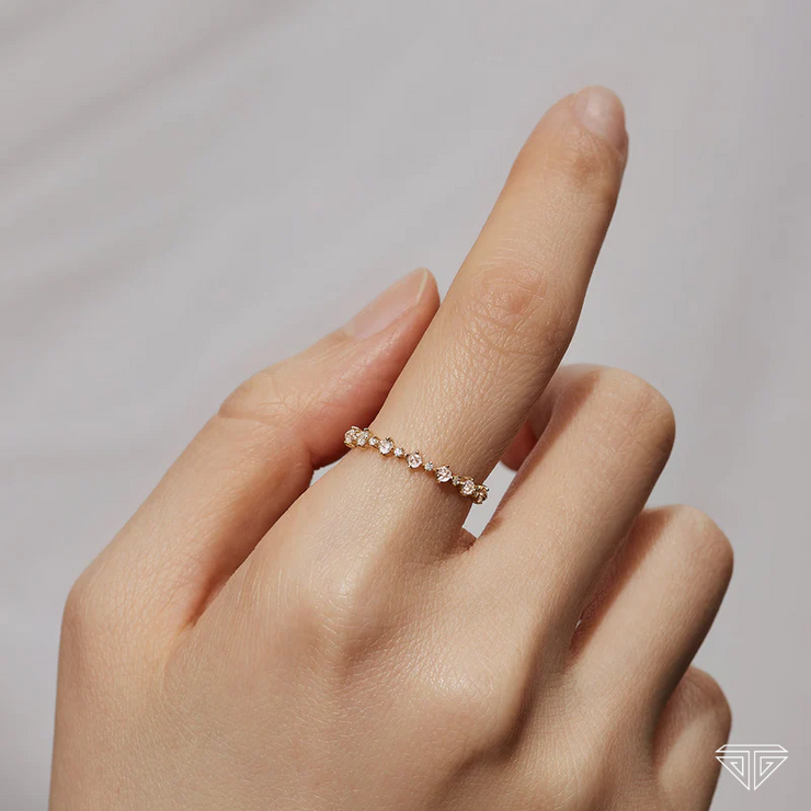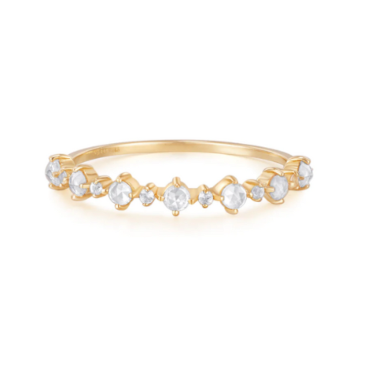 Regular price $350.00 Save $-350.00This beautiful 14K yellow gold band ring features a 0.9mm band width and a white sapphire size of 1.1mm and 2mm. The white sapphire is cut in a rose cut style and gives the ultimate vintage vibe. Wear it alone or stack it!