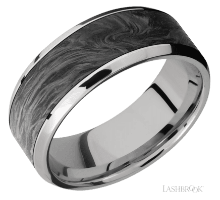 Lashbrook 8 mm wide/Beveled/Cobalt Chrome band with one 6 mm Centered inlay of Forged Carbon Fiber. Size 10 In-Stock for Immediate Delivery.