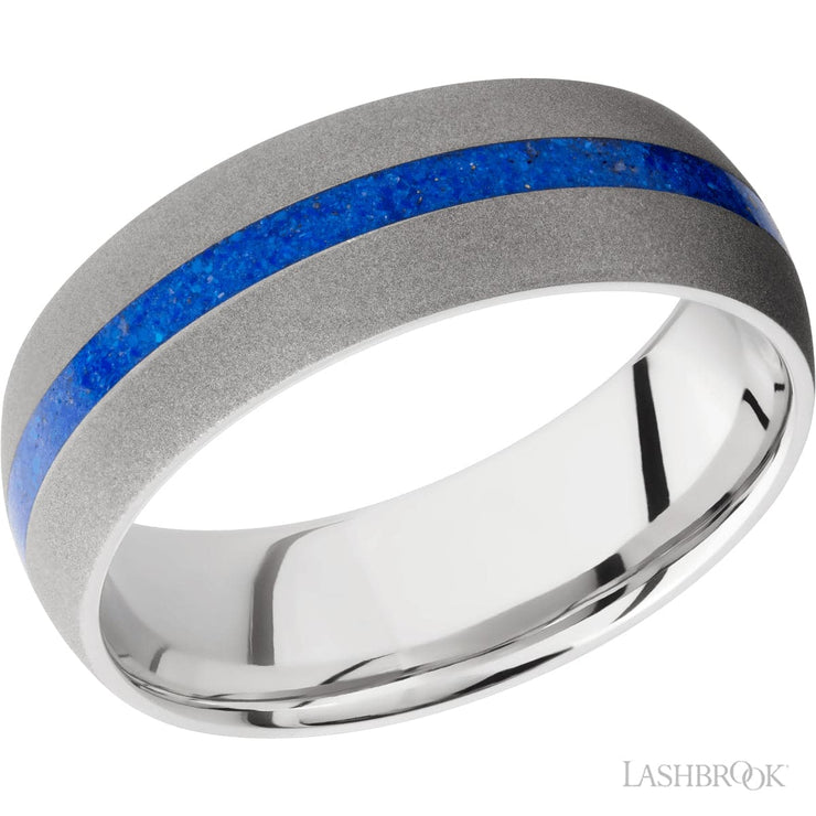 Lashbrook Designs 8mm Wide Domed Cobalt Chrome Band with one 2mm Centered Inlay of Lapis. Size 10 In-Stock for Immediate Delivery. Other sizes can be special ordered. Contact us at sales@avantgardejewelers.com or call us at 512-451-0338.