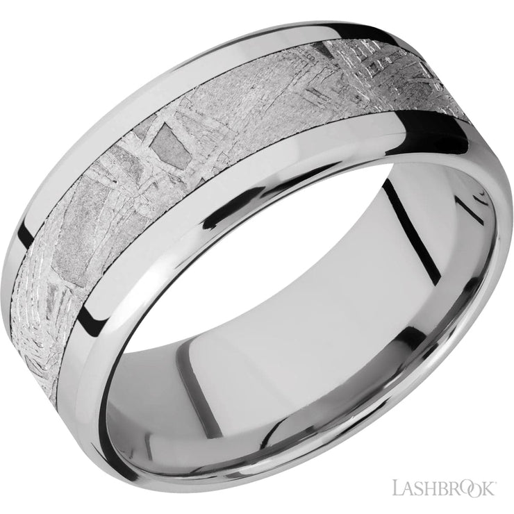 Lashbrook Designs 9mm Wide Beveled Cobalt Chrome Band with one 5mm Centered Inlay of Meteorite. Polish Finish on Cobalt Chrome. Size 10 In-Stock for Immediate Delivery. Other sizes can be special ordered. Contact us at sales@avantgardejewelers.com or call us at 512-451-0338.