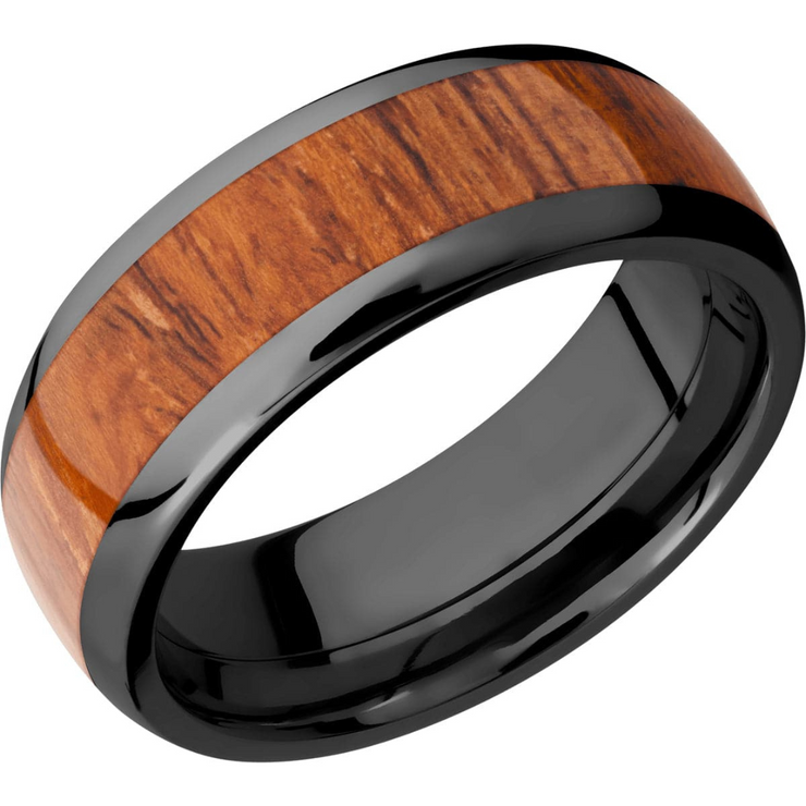 Lashbrook Designs 8mm Wide Domed Zirconium Band with one 5mm Centered Inlay of Desert Iron Wood. Polish Finish.